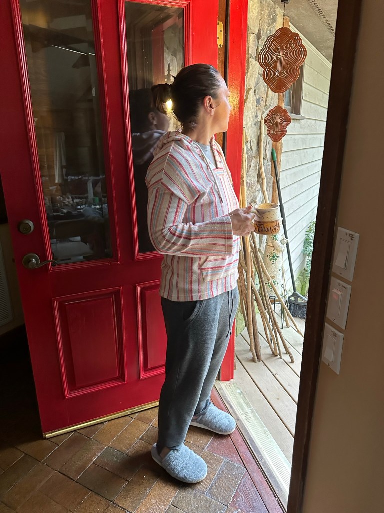 Comfortable clothes, sweats, yoga pants, shorts, jacket or coat that allows you to be comfortable outdoors.